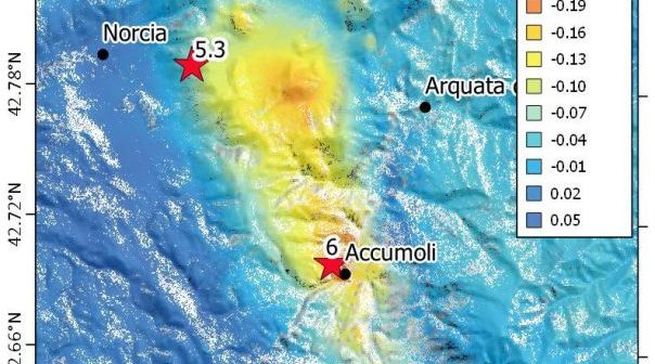 La mappa delle deformazioni co-sismiche superficiali causate dai due eventi di Amatrice-Accumoli e Norcia (magnitudo momento 6.0 e 5.3, rispettivamente), avvenuti, a distanza di circa un’ora, nella notte del 24 agosto 2016, ottenuta con i dati SAR del satellite Sentinel-1 dell’Agenzia Spaziale Europea. Lo spostamento del suolo ha raggiunto valori massimi di circa 20 cm, approssimativamente in abbassamento.