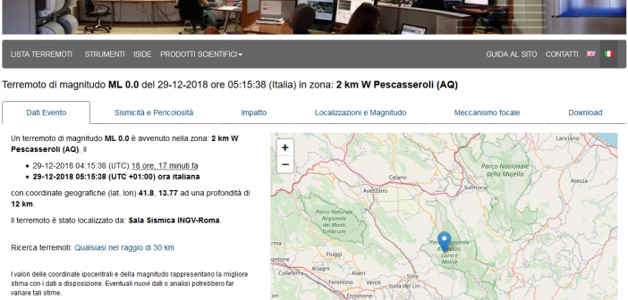 “Il 29 dicembre 2018, alle ore 05.15.38 è stato registrato un terremoto di Ml 0.0 (zero.zero) con epicentro nella zona di Pescasseroli (AQ) con ipocentro alla profondità di 12 km”.