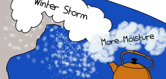 L’aumento delle precipitazioni potrebbe essere particolarmente significativo per tempeste invernali costiere come la Nor’easters, quella che ha sepolto Boston a metà febbraio. Queste tempeste assorbono molta della loro intensità dal contrasto estremo tra l’aria fredda a terra e l’aria calda e umida proveniente dall’oceano. Le temperature oceaniche più calde possono rendere l’aria più calda e umida, amplificando il contrasto. L’aria più umida viene quindi introdotta nel sistema della tempesta, producendo grandi quantità di neve».