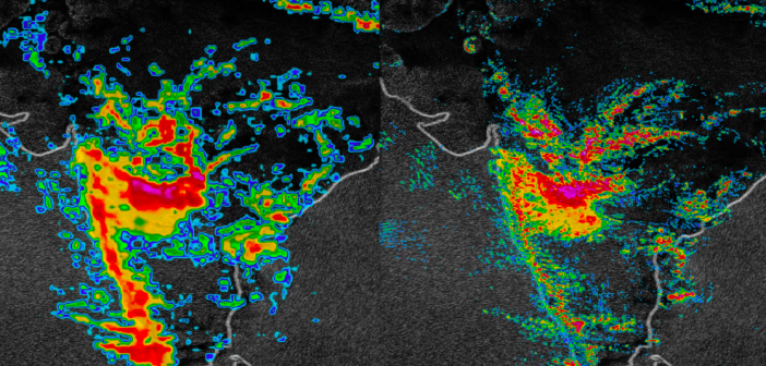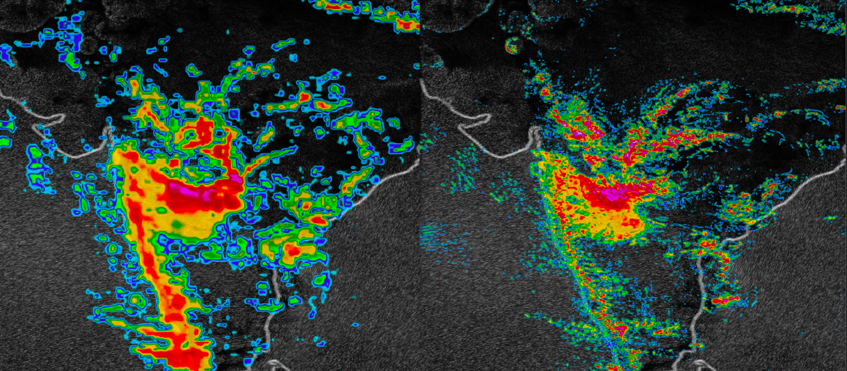 A sinistra, un modello con risoluzione di 13 km mostra gli effetti di un monsone sull’India. Sulla destra, il modello di risoluzione a 3 km rappresenta lo stesso modello meteorologico in modo molto più dettagliato. Credits: IBM