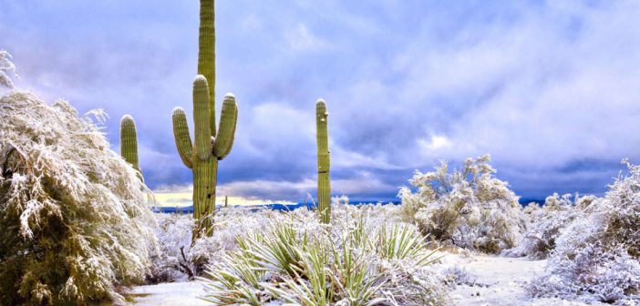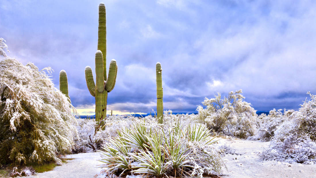 Il deserto di Sonora, che di solito vede temperature invernali fino a 32°C di giorno e 20°C di notte in California e Arizona, ha iniziato il nuovo anno con i suoi famosi cactus di Saguaro coperti da una leggera spolverata di neve.