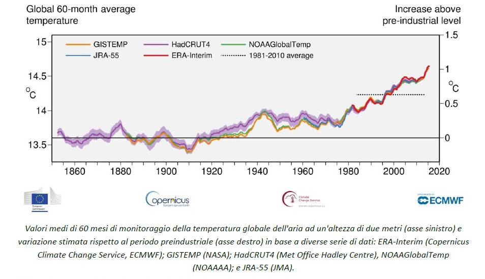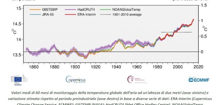 L’ultimo bollettino sui cambiamenti climatici diffuso da Copernicus, il programma europeo di osservazione della Terra, offre il primo quadro completo e globale delle temperature 2018 e dei livelli di CO2: dopo aver elaborato e messo a sistema milioni di osservazioni terrestri, marine, aeree e satellitari raccolte quotidianamente il risultato è inequivocabile. Nel 2018 la temperatura media globale dell’aria superficiale «è stata di 14,8°C, 0,2°C inferiore a quella del 2016, l’anno più caldo mai registrato», ma non si tratta di una buona notizia: «La temperatura media degli ultimi 5 anni è stata di 1,1°C superiore alla media preindustriale (secondo la definizione dell’Ipcc)».