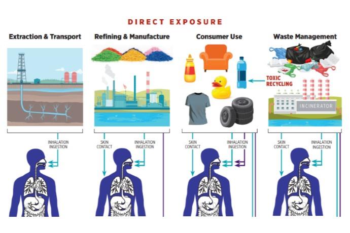 Il 99% della plastica proviene da combustibili fossili. Con l’estrazione di petrolio e gas, in particolare attraverso la fratturazione idraulica per il gas naturale, vengono rilasciate grandi quantità di sostanze tossiche nell’aria e nell’acqua. Oltre 170 prodotti chimici legati alla produzione delle materie prime legate destinate alla plastica hanno impatti sulla salute umana, come il cancro, problemi neurologici, riproduttivi, compromissione del sistema immunitario. Queste tossine hanno impatti diretti e documentati su pelle, occhi e altri organi sensoriali, l’apparato respiratorio, il sistema nervoso, quello gastrointestinale, fegato e cervello.