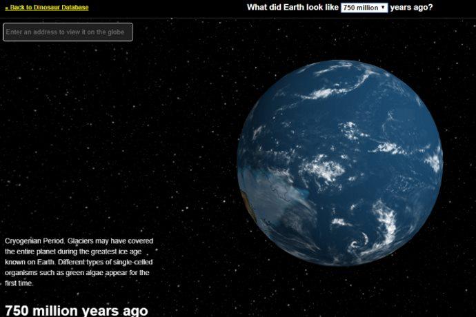 Basta impostare era desiderata (da 750 milioni di anni fa fino ai nostri giorni, con intervalli via sempre sempre più stretti) e la mappa ci restituisce l’immagine del nostro Pianeta, fornendo la location dell’indirizzo impostato, con dettagli sui dinosauri che lo popolavano.