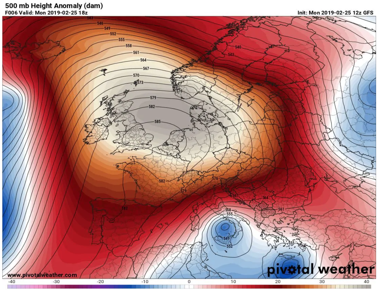 Cresta dell’alta pressione che ha portato l’ondata di calore sull’Europa occidentale, come simulato dal modello americano GFS il 25 febbraio. (PivotalWeather.com)