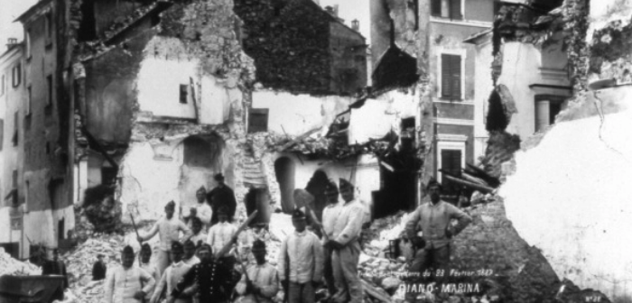 Foto dei danni ad Oneglia. Nella cittadina, che in futuro si sarebbe fusa con porto Maurizio sotto il nome comune di Imperia, si contarono 20 morti e 70 feriti. i danni furono ingenti, al punto che le case rimaste agibili furono meno del 3%.