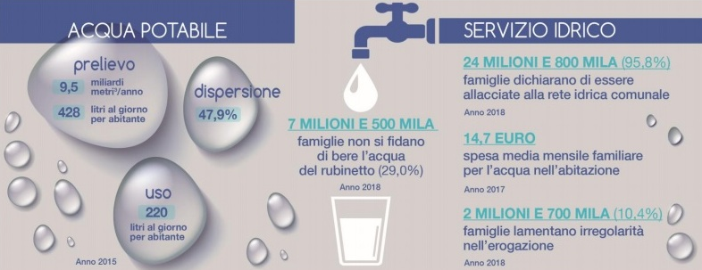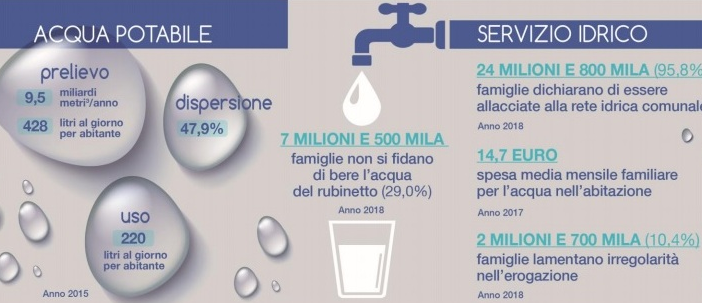 Ad oggi gli investimenti nel servizio idrico nazionale ammontano a 3,6 miliardi di euro/anno, in netto aumento (circa il triplo) rispetto al 2013, ma – in un contesto che rischia di essere stravolto dalla proposta di legge Daga (M5S) su “l’acqua pubblica” in corso d’esame parlamentare – occorre crescere ancora per arrivare almeno alla quota di 5 miliardi di euro/anno, finanziata attraverso la tariffa idrica, ritenuta necessaria dalla aziende di settore. Diminuire le perdite idriche e aumentare la qualità dell’acqua del rubinetto (per l’Istat ancora non si fida il 29% delle famiglie) sarebbe non solo un importante risparmio di risorse naturali, ma anche un beneficio economico per i cittadini, contando che nel 2017 la spesa media mensile di una famiglia per il consumo di acqua minerale è stata pari a 11,94 euro, contro i 14,69 euro legati alla fornitura di acqua nell’abitazione ogni famiglia: rispetto al 2014, si osserva infatti una crescita delle spese familiari per acqua minerale (+20,6%) maggiore rispetto a quelle per la fornitura di acqua alle abitazioni (+11,8%).