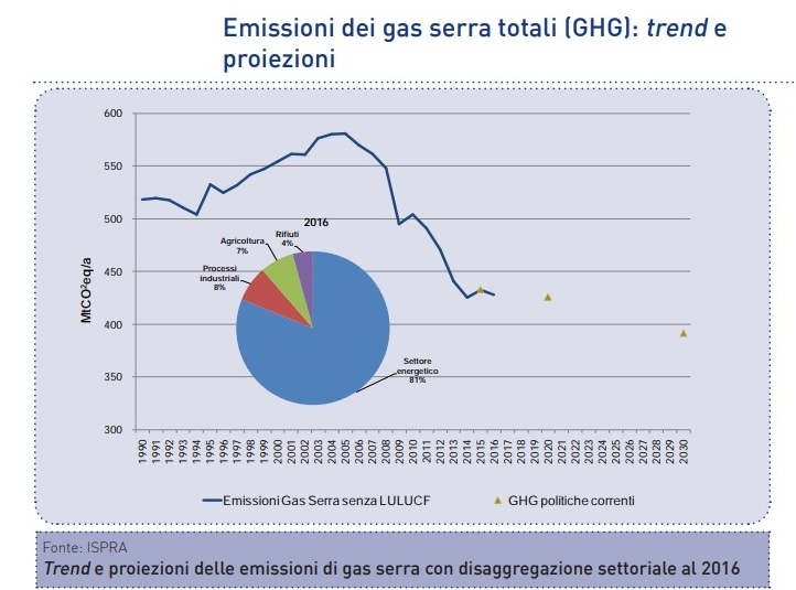 Nonostante le emissioni totali di gas a effetto serra italiane siano diminuite del 17,5%, nel periodo 1990- 2016 – un risultato spiegato «anche dalla recessione economica, che ha frenato i consumi negli ultimi anni» –, nel 2017 l’anomalia della temperatura media in Italia è stata di +1,30 °C, superiore a quella globale sulla terra ferma (+1,20 °C). E se in questa pubblicazione l’Ispra non aggiunge dati più recenti, recentemente è stato il Cnr a informare che il 2018 risulta per l’Italia l’anno più caldo da oltre due secoli.