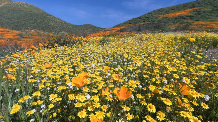 In genere, puoi aspettarti di vedere una superfioritura come questa ogni decennio. Tuttavia, questa è la seconda volta che questo angolo della California meridionale vede un simile evento in 3 anni, l’ultimo dei quali nel 2017 . Anche se è un fenomeno bello da vedere, è molto insolito avere due super fioriture in due anni, rese possibili solo da circostanze ben precise: un inverno piovoso ma freddo all’inizio, seguito da un periodo caldo a  inverno inoltrato.