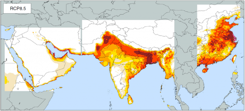 Figura 2. Probabilità annuale di insorgenza di ondate di calore estreme a 4°C di riscaldamento rispetto al periodo 1861-1880 (che è probabile entro il 2070) dcon livello di temperatura percepita di 55°C, che corrisponde approssimativamente ad una temperatura di rugiada di 33°C, con picchi superiori ai 35°C. Il colore arancione significa che tali temperature saranno raggiunte ogni due anni in media. Fonte .