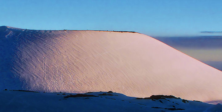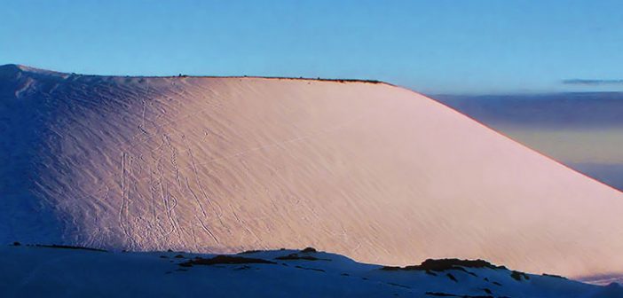 Tre persone fotografate nel cratere di Pu’u Wekiu, che stanno misurano il fondo e la parte superiore di un corpo di ghiaccio sepolto già documentato nel 1974. Le aree ombreggiate illustrano l’estensione di allora e quella presente adesso. (Foto courtesy / Hawaii University)