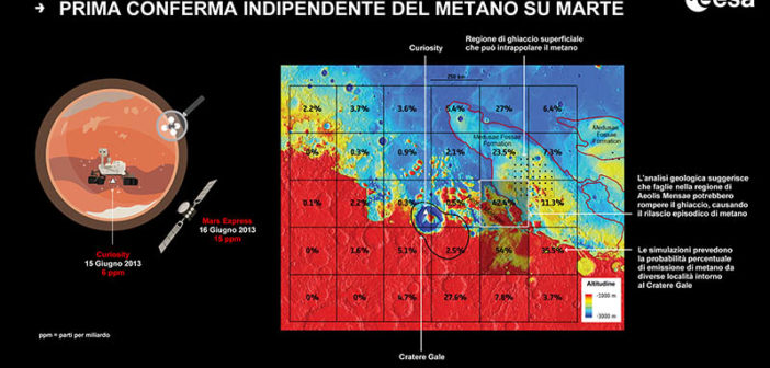 L’emissione di metano su Marte rilevata nel 2013 dal rover Curiosity della NASA è stata confermata, in modo del tutto indipendente, da un team internazionale di ricercatori guidato da Marco Giuranna dell’Istituto Nazionale di Astrofisica (INAF) e a cui hanno partecipato ricercatori dell’Istituto Nazionale di Geofisica e Vulcanologia (INGV) e dell’Agenzia Spaziale Italiana (ASI), grazie alle misure dello strumento italiano PFS (Planetary Fourier Spectrometer) a bordo della sonda dell’ESA Mars Express. Il team ha inoltre individuato la possibile zona di emissione, in una regione del pianeta situata circa 500 chilometri ad est del cratere Gale.