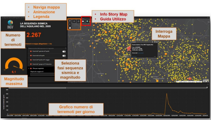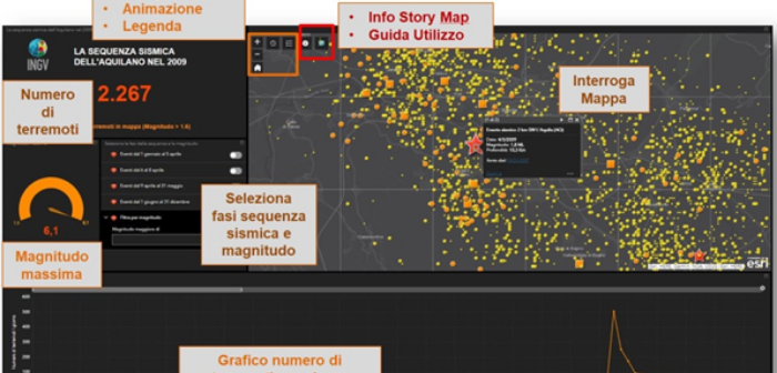 La “story map” è un’applicazione web che attraverso mappe interattive, contenuti multimediali e funzioni di interazione l’INGV utilizza al fine di migliorare l’informazione, la didattica e la comunicazione anche di fenomeni naturali come la sismicità. Grazie agli strumenti di interazione e le funzionalità di info-grafica presenti nell’interfaccia dell’applicazione è possibile avere informazioni sul numero di eventi e sulla magnitudo massima in mappa, interrogare ogni singolo terremoto per visualizzarne i parametri ipocentrali, selezionare gli eventi sismici dei vari periodi della sequenza (fasi temporali) o in base alla loro magnitudo. Infine attivando il cursore temporale sarà possibile visualizzare i terremoti in un determinato intervallo di tempo e far partire un’animazione, giorno per giorno, della sismicità.