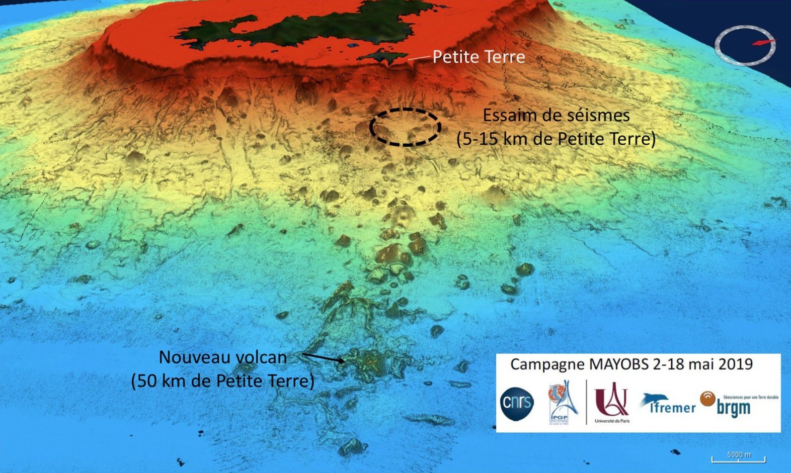 Queste missioni, condotte da vari organismi ( il Centro nazionale per la ricerca scientifica (CNRS), con l’Ufficio di ricerca geologica e mineraria (BRGM), l’Istituto di fisica terrestre di Parigi (IPGP), l’Istituto francese di ricerca per lo sfruttamento del mare (IFREMER), l’Università della Riunione, l’Istituto di Fisica della Terra di Strasburgo (IPGS), l’Istituto Nazionale di Informazione Geografica e Forestale (IGN), la Scuola Normale (ENS), il Centro nazionale per gli studi spaziali (CNES) e il Servizio idrografico e oceanografico della marina (SHOM) e la nave oceanografica) hanno evidenziato un nuovo vulcano sottomarino situato 50 km da Petite-Terre, un’isola dell’Arcipelago. E’ situato a 3.500 metri di profondità, ha una base di 4-5 km di diametro e un’altezza di circa 800 metri. Un pennacchio di fluidi vulcanici di 2 km lo sovrasta ma al momento non raggiunge la superficie marina.