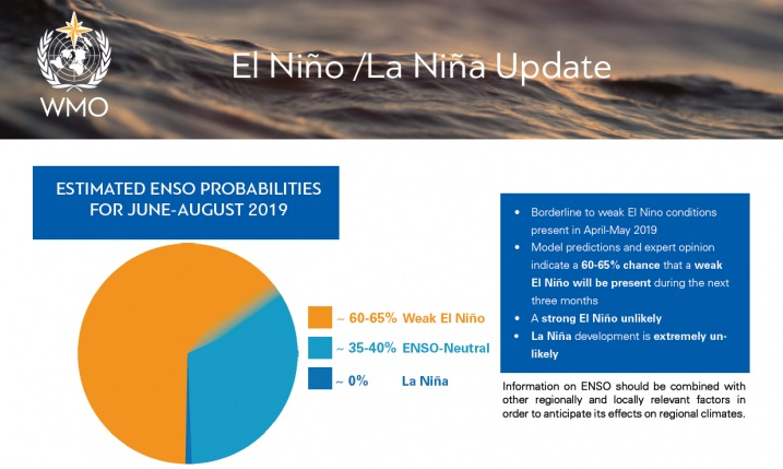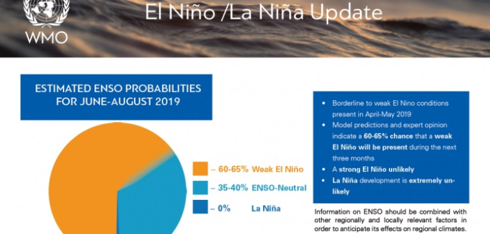 Secondo il nuovo aggiornamento El Niño/La Niña  pubblicato dalla World meteorological organization  (Wmo)  «La probabilità di un episodio El Niño intenso che si sviluppi nel 2019 è bassa«. Una previsione che si basa su modelli sviluppati da esperti da tutto il mondo.