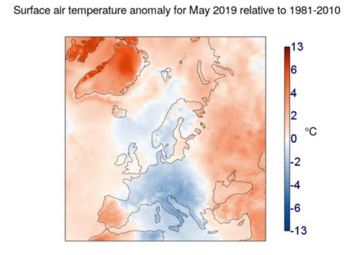 Il freddo anomalo delle scorse settimane alle nostre latitudini è legato all’aumento della temperatura artica. Per i primi cinque mesi del 2019 il Cnr stima una massima a +0,59°C e una minima a +0,16°C.