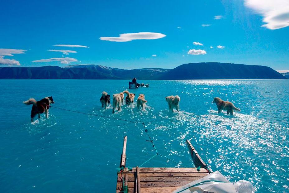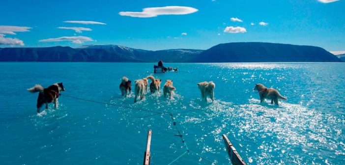 La Groenlandia la scorsa settimana ha registrato temperature da record, oltre 4°C in più rispetto alla media e gli effetti purtroppo si sono subito visti: in un solo giorno si sono sciolte circa 2 miliardi di tonnellate di ghiaccio sul 40% del territorio dell’isola. E il risultato è tutto riassunto non solo dalla scienza, ma anche in una foto scattata giovedì 13 gugno 2019 in cui i cani da slitta avanzano e si fanno sstrada con le zampe nell’acqua ghiacciata ormai sciolta.