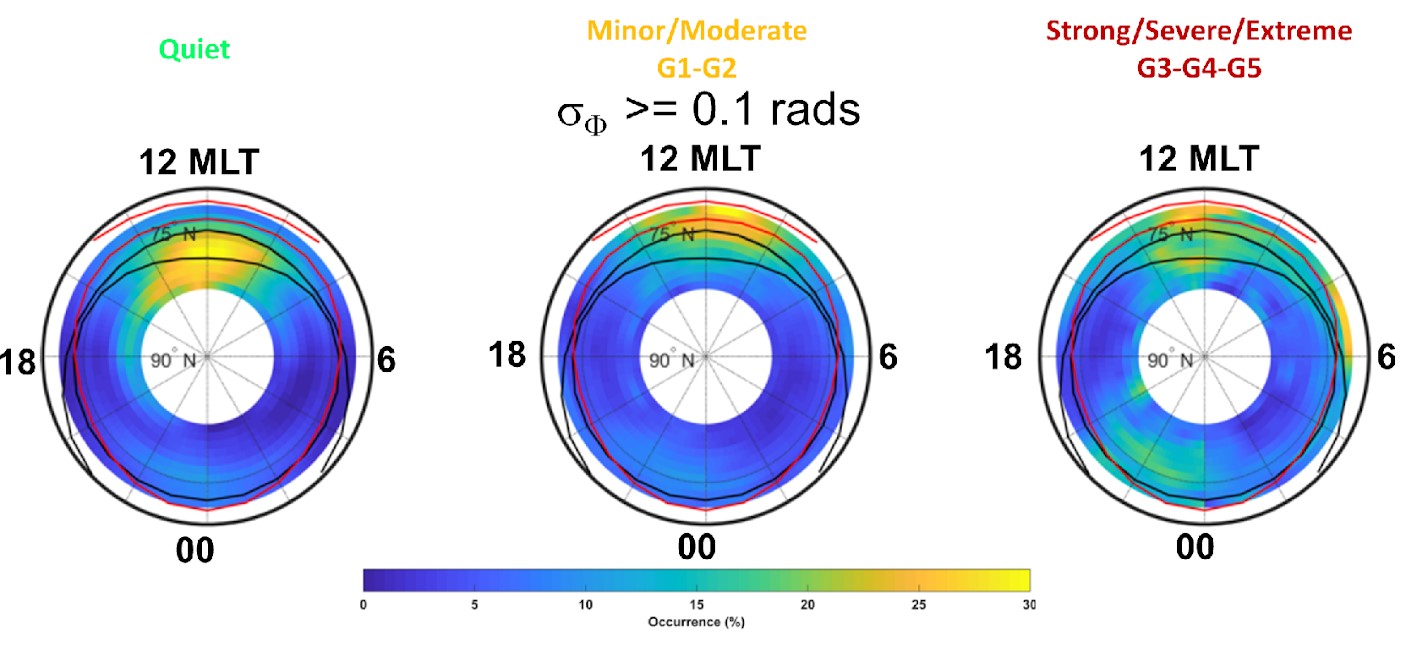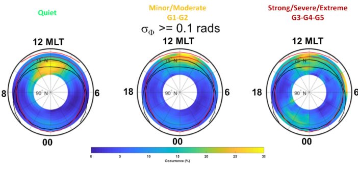 Immagine 1 – Probabilità di disturbo del segnale GPS in funzione della latitudine e dell’ora del giorno (in un riferimento magnetico) per diversi livelli di disturbo di origine solare (condizioni quiete a sinistra, condizioni di disturbo da minori a moderate al centro, condizioni da forti ad estreme a destra).