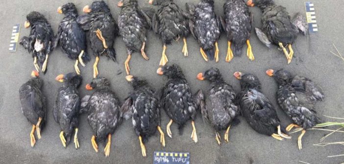 Non solo, ma quelli sono solo gli esemplari che la squadra ha trovato, contrassegnato e fotografato a fini della registrazione. I ricercatori hanno stimato che siano morte in totale da 3.150 a 8.800 esemplari dei volatili, con le pulcinelle di mare che costituivano l’87% degli uccelli deceduti, seguite dale auklets crestate, gli uccelli neri con un pennacchio che spunta proprio tra i loro occhi.