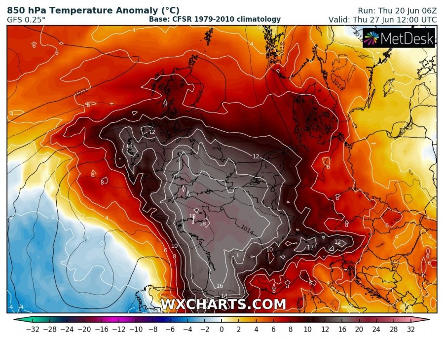 La sequenza anomala della temperatura a 850 hpa indica che l’ondata di calore si intensificherà in modo significativo martedì sulla Francia, espandendosi nel Regno Unito e in Irlanda fino a sabato e proseguendo attraverso il Benelux e la Germania fino al wweekend. Sembra più probabile che possa interessare anche tutta l’Inghilterra, e sono sempre più probabili giornate piuttosto calde anche su Irlanda e Scozia.