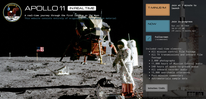 I filmati del controllo missione, quelli girati dagli astronauti, così come le trasmissioni televisive trasmesse dallo spazio e dalla superficie della Luna, sono stati accuratamente posizionati nei momenti esatti in cui sono stati girati durante la missione, così come ogni foto scattata e ogni parola pronunciata. È possibile scegliere se iniziare a ripercorrere quell’avventura un minuto prima del lancio, con il bottone arancione “T-minus 1m”, oppure proiettarsi in un momento preciso di quella missione di 50 anni fa grazie al bottone blu “Now”.