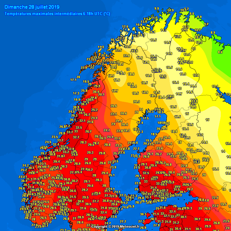 La giornata bollente ha interessato anche molte zone della Svezia e della Norvegia. Di seguito sono elencate le prime 15 stazioni ufficiali METAR / SYNOP con le temperature più elevate in tutta la Scandinavia ieri, 28 luglio: