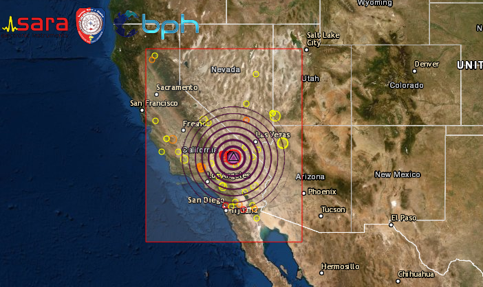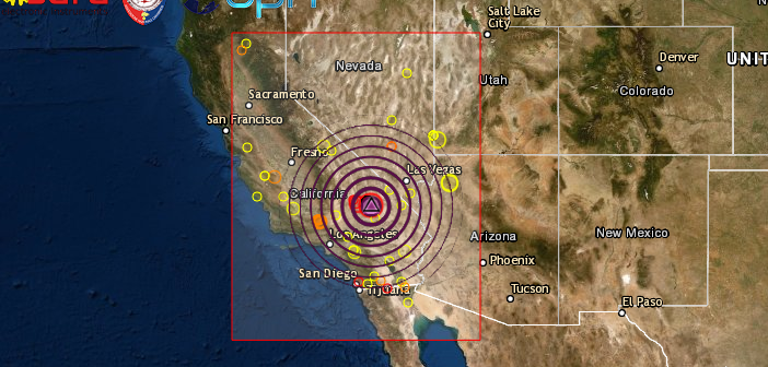 L’epicentro è stato rilevato sulla terraferma, nella zona del deserto del Mojave, 12km a SW della località di Searles Valley, evento avvertito dalla popolazione in gran parte della California centrale, ci sono danni in diverse zone e anche alcuni incendi, ma non si hanno al momento notizie di vittime