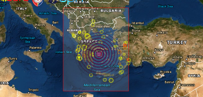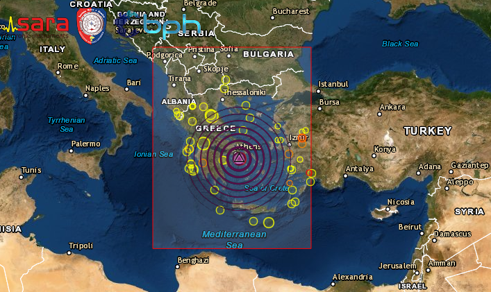 Epicentro 18 km a Nord Ovest di Atene, ipocentro a circa 20 km di profondità, evento avvertito distintamente nella capitale greca, potrebbero esserci danni.
