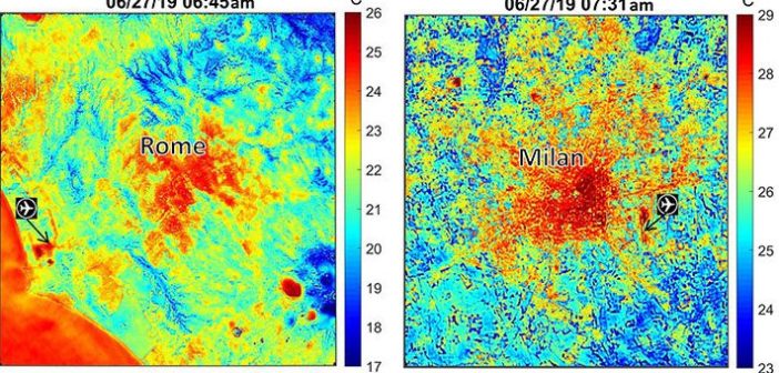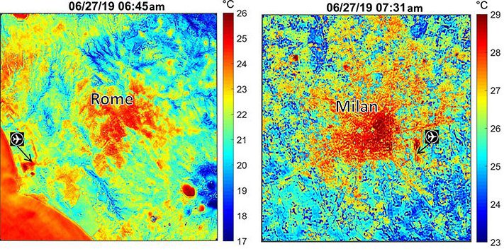 ECOSTRESS ha mappato la superficie, o temperatura del suolo, di quattro città europee, Roma, Parigi, Madrid e Milano, durante le mattine del 27 giugno e del 28 giugno. Nelle immagini, le temperature più calde appaiono in rosso e le temperature più fredde appaiono in blu. Queste mostrano come il nucleo centrale di ogni città sia molto più caldo del paesaggio naturale circostante a causa dell’effetto isola di calore urbana, un effetto derivante delle superfici urbane che immagazzinano e riflettono calore durante il giorno.