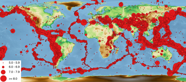 Distribuzione dei terremoti di magnitudo 5 o superiore nel periodo 1973-2019 secondo il catalogo USGS.