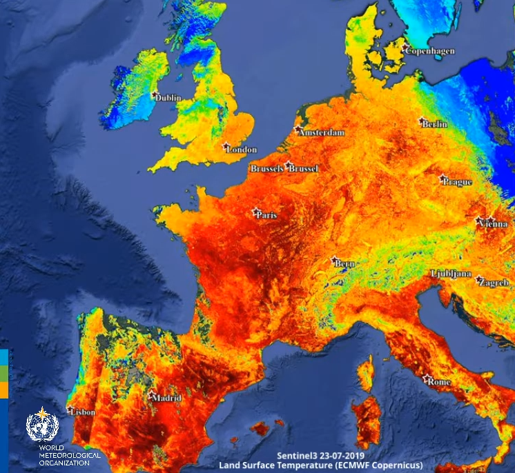 L’ondata di caldo di luglio fa seguito all’ondata di caldo precoce ed eccezionalmente intensa di a giugno, che ha stabilito nuovi record delle temperature in Europa, facendo del giugno 2019 il più caldo mai registrato per il continente, con una temperatura media di 2° C al di sopra del normale. Giugno è stato anche il giugno più caldo mai registrato a livello globale .