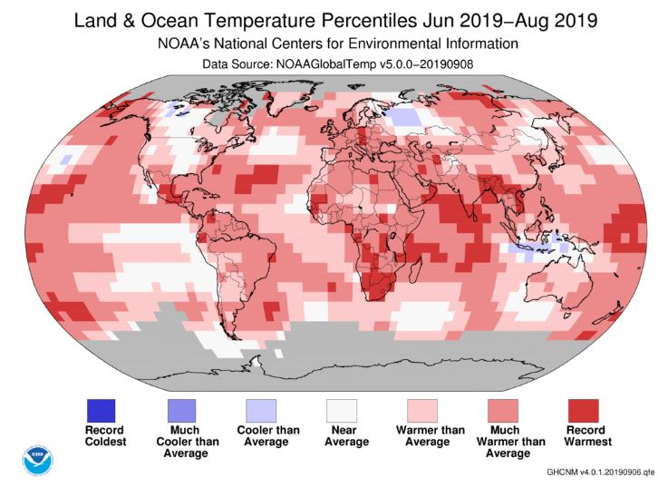 In tutto il mondo ad agosto sono state registrate temperature torride o sopra la media che lo hanno fatto diventare il secondo agosto più caldo mai registrato e portato l’estate 2019 – estate meteorologica da giugno ad agosto – ad essere la calda mai registrata nell’emisfero settentrionale, con record simili a quella del 2016. Il caldo ha anche influenzato la copertura di ghiaccio del Mare Artico che ad agosto ha raggiunto la seconda più piccola estensione mai registrata.