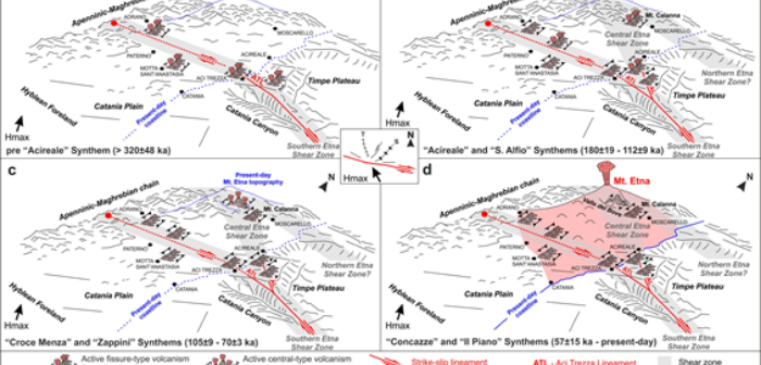 “A partire da almeno 500.000 anni fa”, spiega Marco Firetto Carlino, ricercatore dell’INGV e primo autore dell’articolo, “l’attività tettonica di un’ampia zona di faglia nella parte meridionale del vulcano (tra Acireale ed i dintorni di Adrano) ha portato alla formazione di zone di “apertura” della crosta terrestre. Queste hanno rappresentato le vie preferenziali per la risalita dei magmi emessi attraverso fessure eruttive diffuse lungo la faglia. Tali fessure sono state individuate tra Aci Trezza e Adrano e caratterizzano le prime fasi dell’attività etnea. La continua deformazione trascorrente lungo la medesima zona di faglia e, successivamente, anche lungo ulteriori zone più a nord, nonché la loro reciproca interazione, ha portato alla migrazione del vulcanismo e, nel contempo, alla chiusura repentina dei condotti eruttivi precedentemente attivi. Questo fenomeno spiega il processo di migrazione del vulcanismo dal versante meridionale (attivo da almeno 500.000 a circa 200.000 anni fa), fino all’area della Valle del Bove (da circa 100.000 a 70.000 anni fa) e agli attuali centri eruttivi (da circa 60.000 anni fa ad oggi)”.