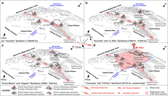 Modello schematico che illustra l’evoluzione nello spazio e nel tempo del vulcanismo etneo, guidato da una tettonica di tipo trascorrente, controllata dal campo di stress regionale mostrato al centro dell’immagine (T: apertura; S: raccorciamento; Hmax: asse di massimo stress orizzontale). (a): a partire da almeno 500.000 anni fa, l’attività di un’ampia zona di faglia a cinematismo trascorrente (“Southern Etna Shear Zone”) ha creato zone di locale distensione crostale (releasing zones), vie preferenziali per la risalita dei magmi. La continua deformazione lungo la “Southern Etna Shear Zone” e, successivamente, lungo ulteriori zone di trascorrenza propagatesi più a nord (p.e. “Central Etna Shear Zone”), nonché la loro reciproca interazione hanno portato alla migrazione del vulcanismo lungo il versante meridionale e nell’area della Valle del Bove (b e c), fino agli attuali centri eruttivi (d). La migrazione delle aree in distensione, e quindi del vulcanismo, si associava alla chiusura repentina dei condotti eruttivi precedentemente attivi attraverso fenomeni di locale inversione tettonica positiva (cd. traspressione).