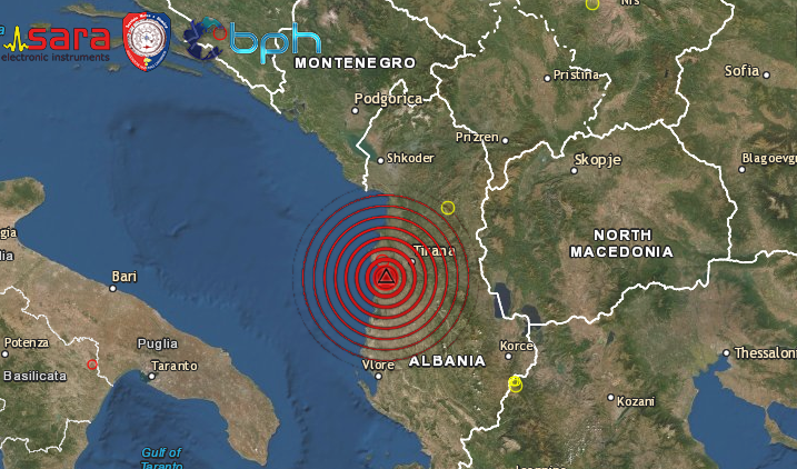 Evento seguito da una replica di Mb 5.3, epicentro 34 km a ovest della capitale Tirana, 6 km a nord di Durazzo. Potrebbero esserci danni a cose e persone, evento avvertito anche sulla costa pugliese