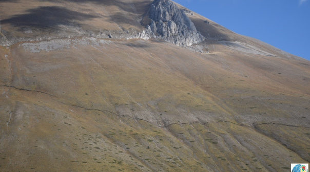 Vista del versante occidentale del monte Vettore dove si notano due scarpate di faglia cosismiche prodotte dall’evento del 30 ottobre, una più in quota lungo il piano di faglia principale e una più in basso lungo una faglia minore.