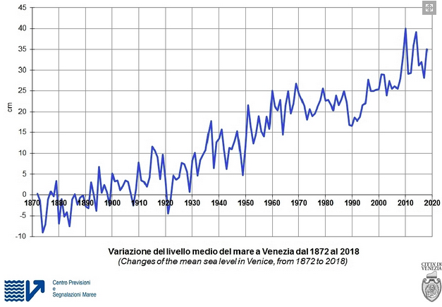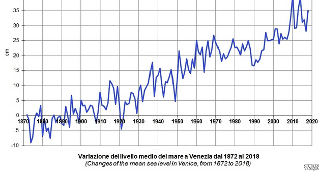 La conta dei danni per l’alta marea che ha sommerso Venezia è appena iniziata – l’entità dei danni alla basilica di San Marco sta emergendo pian piano ad esempio, come documenta la Procuratoria –, ma l’unica cosa certa è che il dramma ricapiterà prima di quanto ci aspettiamo se non verranno messe in campo adeguate misure di mitigazione dei cambiamenti climatici (e di adattamento per quella parte di cambiamento ormai inevitabile). Come spiega infatti il climatologo Vincenzo Ferrara «l’innalzamento relativo del livello medio del mare sta avvenendo a ritmi impressionanti nella laguna Veneta. Dal 1872 ad oggi l’innalzamento del livello del mare è stato prossimo ai 40 cm», picco toccato pochi anni fa per poi attestarsi per il momento attorno ai 35 cm (si veda il grafico a lato).