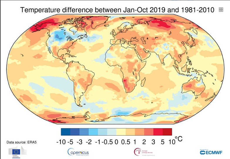 La World meteorological organization (Wmo) ha sottolineato che «Tutto sembra indicare che il 2019 sarà al secondo o al terzo posto degli anni più caldi mai registrati». Infatti, tra gennaio e ottobre 2019 la temperatura mondiale è stata superiore di circa 1,1 gradi celsius a quella del periodo pre-industriale. Nel 2018 e concentrazioni di CO2 nell’atmosfera avevano raggiunto il livello record di 407,8 parti per milione (ppm) e nel 2019 sono continuate ad aumentare. La Wmo ricorda che «La CO2 perdura nell’atmosfera per secoli e nell’oceano ancora di più, perpetuando così il cambiamento climatico». Il record di anno più caldo mai registrato resta al 2016, ma va ricordato che iniziò con un episodio di El Niño eccezionalmente forte.