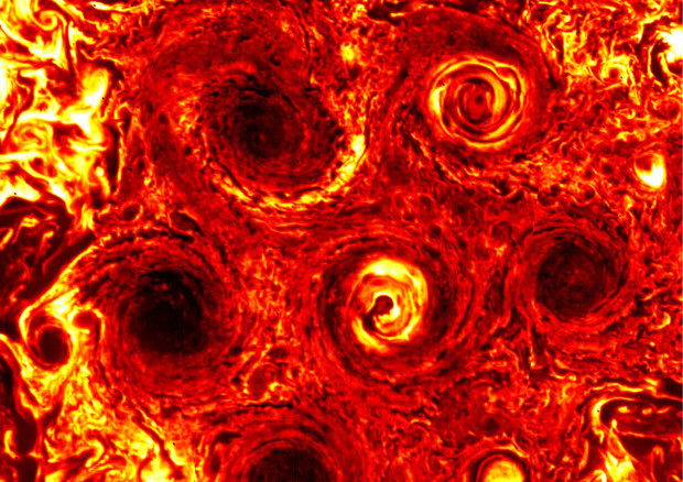 Giganteschi cicloni si sono formati nella zona attorno al Polo Sud di Giove; sono sette e vicini fra loto, ognuno di essi è vasto almeno quanto gli Stati Uniti e insieme appaiono come un esagono di velluto rosso e giallo dall’effetto quasi ipnotico. Li ha fotografati la missione Juno della Nasa grazie allo strumento Jiram (Jovian InfraRed Auroral Mapper), è uno dei due strumenti italiani a bordo della sonda, realizzato da Leonardo sotto il coordinamento dell’Agenzia Spaziale Italiana (Asi) e in collaborazione con l’Istituto Nazionale di Astrofisica (Inaf); l’altro strumento è al servizio della radioscienza, si chiama KaT (Ka-band Translator) ed è realizzato da Thales Alenia Space (Thales-Leonardo) e Università Sapienza di Roma, con il finanziamento dell’Asi.