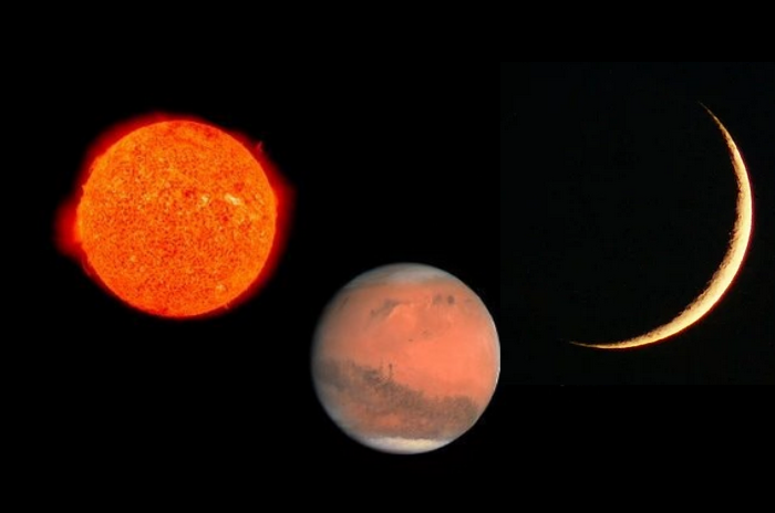 Il primo oggetto ad apparire nel firmamento sarà la sottile falce di Luna calante (la Luna Nuova è attesa alle 22:42 di venerdì 24 gennaio), che inizierà la sua cavalcata sulla volta celeste a partire dalle 03:20 del mattino (ora di Roma). Circa un’ora più tardi farà la sua comparsa anche il Pianeta Rosso, che darà l’inizio alla congiunzione astrale. L’idillio a due durerà ben poco, poiché dopo un quarto d’ora farà la sua comparsa anche la stella Antares, che rivaleggia con Marte a causa della medesima colorazione rossa. Antares, del resto, significa “Anti-Ares” o “simile ad Ares”, dove Ares è il dio della guerra per i greci, l’equivalente di Marte per i romani. Benché di colori simili, i due oggetti saranno facilmente distinguibili: Marte si troverà infatti a sinistra, mentre Antares sarà poco più in basso a destra. Ricordiamo che le stelle producono la propria luce attraverso le reazioni nucleari e dunque brillano, mentre i pianeti del Sistema solare come Marte riflettono la luce del Sole, quindi risultano sì luminosi, ma non brillanti.
