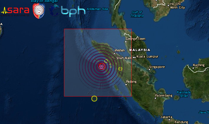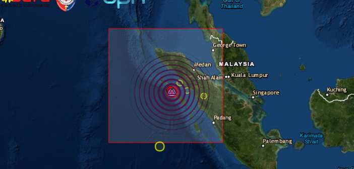 L’epicentro è stato localizzato in mare, a sud della costa occidentale dell’isola di Pulau, 16km SSW della località di Sinabang, potrebbero esserci danni.