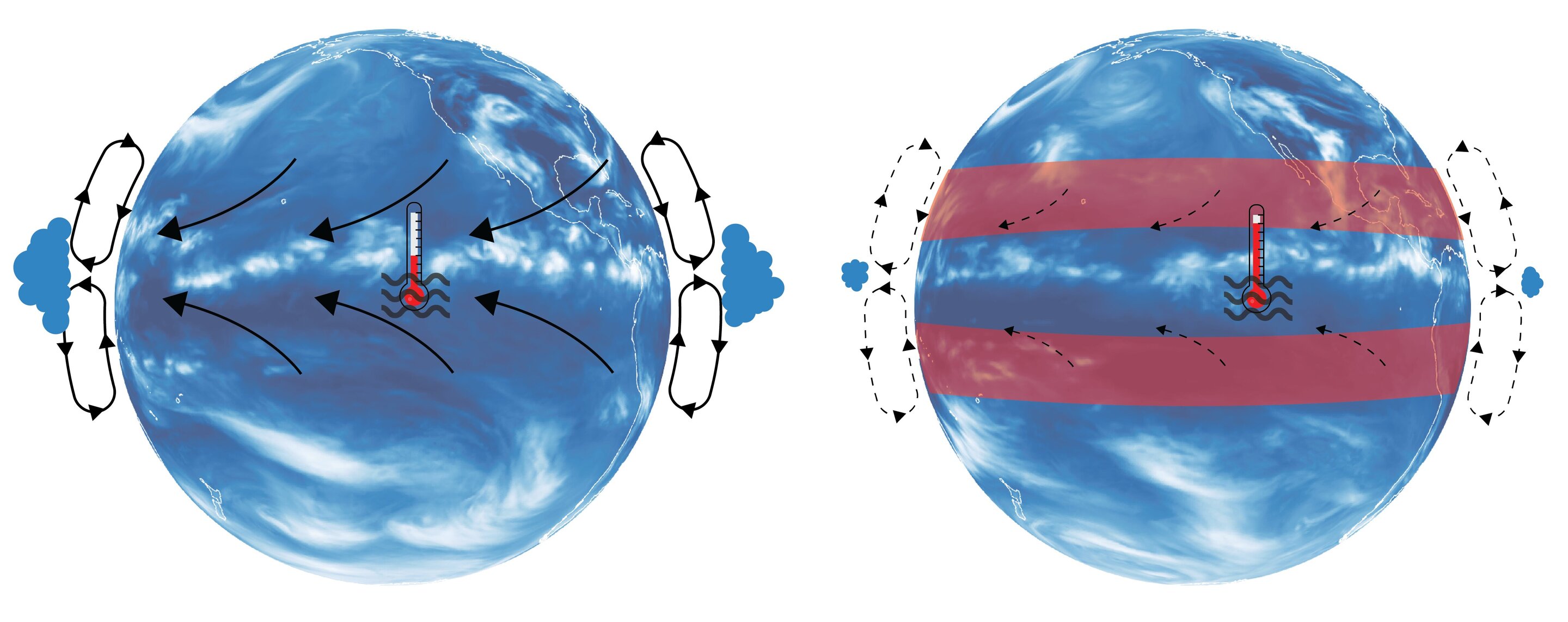 Illustrazione della cellula atmosferica di Hadley nelle condizioni attuali (a sinistra). Il riscaldamento subtropicale porta ad un indebolimento della cellula Hadley (a destra), meno nuvole nella maggior parte dei tropici, una riduzione del riscaldamento delle acque fredde dell’oceano e un conseguente aumento delle temperature tropicali. Questo processo spiega il riscaldamento tropicale accelerato riscontrato nei modelli climatici in risposta all’aumento delle emissioni di gas serra. Credits: Elke ZellerIl team ha scoperto che il riscaldamento futuro previsto ai tropici proverrà principalmente dal riscaldamento che si verifica nelle regioni subtropicali. “Per comprendere questo fenomeno sorprendente, bisogna capire come diverse aree interagiscono tra loro a livello climatico”, afferma la dott.ssa Malte Stuecker dell’ICCP e autore principale dello studio.