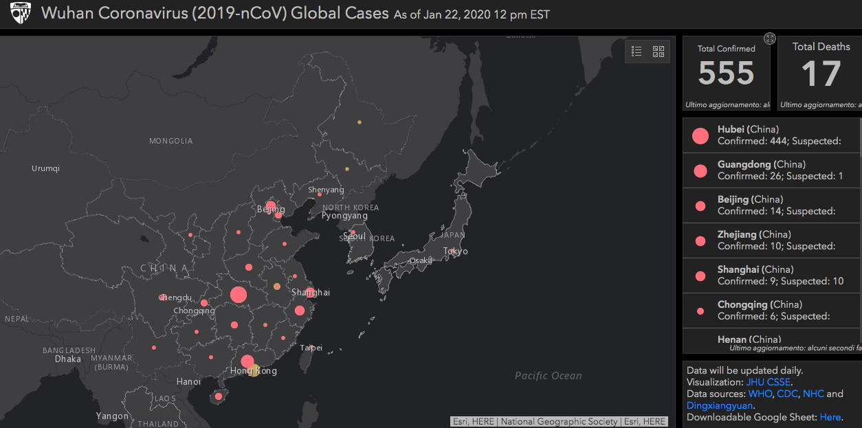 Mercoledì 22 gennaio pomeriggio, ora cinese, i rapporti ufficiali hanno riferito che 444 persone sono state ricoverate in ospedale e almeno 17 sono morte per il nuovo coronavirus. Ma la mappa lanciata mercoledì dai ricercatori del Center for Systems Science and Engineering della Johns Hopkins University suggerisce che questi numeri potrebbero aumentare più rapidamente di quanto mostrato dalle fonti nazionali.