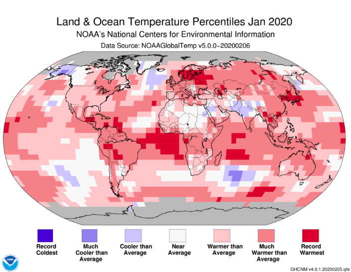 Il mese di gennaio appena concluso, è stato il più caldo da quando la NOAA ha iniziato a monitorare le temperature mensili, secondo il National Center for Environmental Information della NOAA. Un’analisi statistica aggiunge inoltre che il 2020 è sulla buona strada per classificarsi tra i cinque anni più caldi mai registrati.