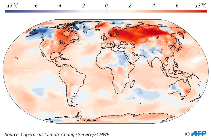 Mappa del mondo che mostra un’anomalia della temperatura superficiale dell’aria per gennaio 2020 rispetto alla media 1981-2010, secondo un rapporto di Copernicus Climate Change Service / ECMWF.