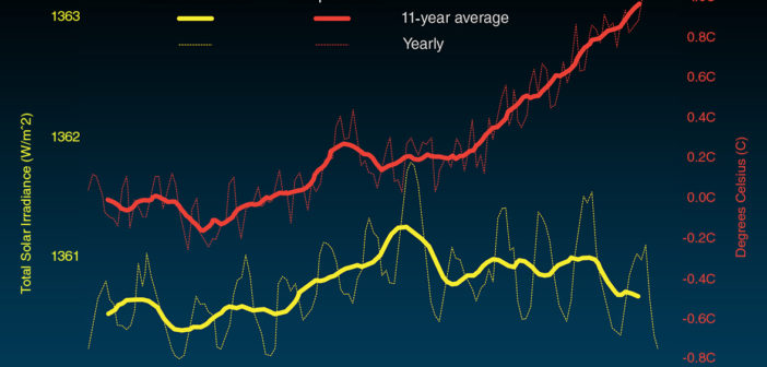 Il grafico sopra confronta i cambiamenti globali della temperatura superficiale (linea rossa) e l’energia del Sole ricevuta dalla Terra (linea gialla) in watt (unità di energia) per metro quadrato dal 1880. Le linee più chiare / più sottili mostrano i livelli annuali mentre i più pesanti / le linee più spesse mostrano le tendenze medie degli 11 anni. Le medie su undici anni vengono utilizzate per ridurre il rumore naturale di anno in anno nei dati, rendendo più evidenti le tendenze sottostanti.