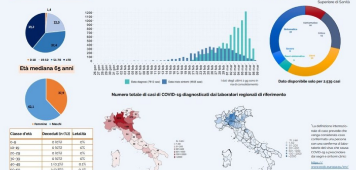 L’Iss precisa che su 8342 casi positivi al 9 marzo alle ore 10 (si tratta di dati individuali di casi con test positivo per SARS-COV-2 diagnosticati dalle Regioni/PPAA, che possono dunque differire dai dati forniti dalla Protezione Civile che raccoglie dati aggregati) l’1,4% ha meno di 19 anni, il 22,0% è nella fascia 19-50, il 37,4% tra 51 e 70 e il 39,2% ha più di 70 anni, per un’età mediana di 65 anni. Il 62,1% è rappresentato da uomini. Sono 583 gli operatori sanitari positivi. Il tempo mediano trascorso tra la data di insorgenza dei sintomi e la diagnosi è di 3-4 giorni. Il 10% dei casi è asintomatico, il 5% con pochi sintomi, il 30% con sintomi lievi, il 31% è sintomatico, il 6% ha sintomi severi e il 19% critici. Il 24% dei casi esaminati risulta ospedalizzato.