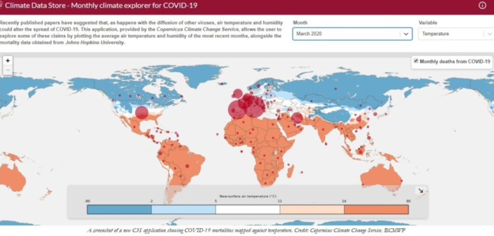 Anche i legami tra pandemia e indicatori climatici non vengono trascurati. Dati ambientali quali temperatura, umidità e radiazioni UV della superficie terrestre possono infatti essere utilizzati dai ricercatori per individuare i determinanti climatici ed esplorare le ipotesi secondo cui temperatura e umidità potrebbero influenzare la diffusione del coronavirus Sars-Cov-2. Questi dati «offrono alla società informazioni autorevoli sul clima passato, presente e futuro in Europa e nel resto del mondo», sottolinea Carlo Buontempo, direttore di Copernicus climate change service. In quest’ottica è nata un’altra applicazione (in immagine) in grado di mappare questi dati rispetto alle posizioni dei decessi Covid-19: «Può anche essere utile per identificare le aree dove il clima è favorevole o meno alla diffusione dei coronavirus che potrebbero generarsi in futuro», spiegano da Copernicus.