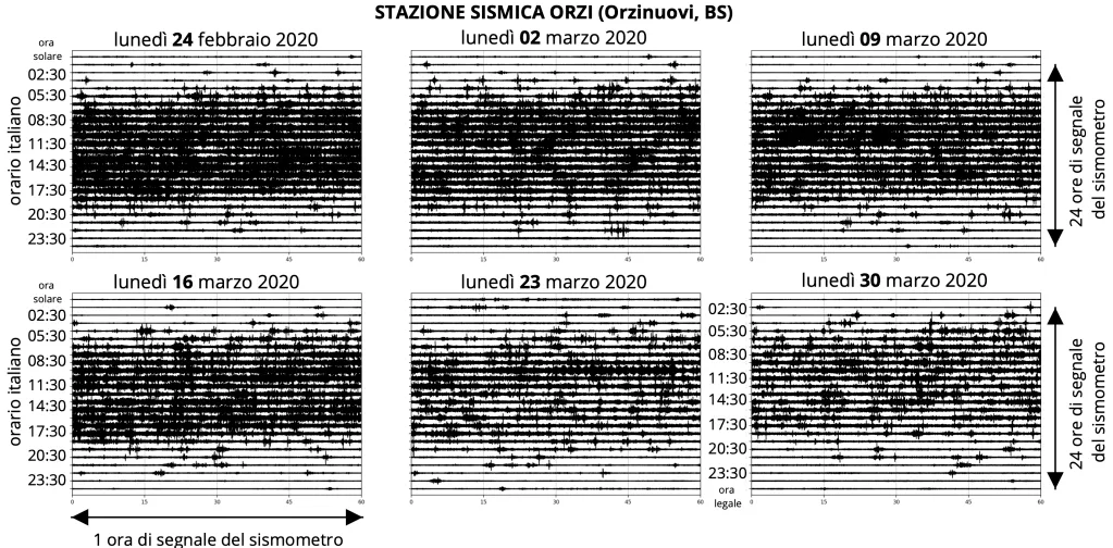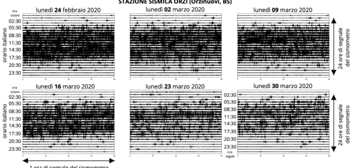 Si tratta del cosiddetto rumore antropico, visibile chiaramente in tutte le stazioni sismiche sufficientemente vicine a città, paesi o infrastrutture come ferrovie e strade. Ad esempio osservando il segnale sismico giornaliero registrato dalla stazione di Orzinuovi, in provincia di Brescia (codice stazione ORZI) ogni lunedì dal 24 febbraio al 30 marzo 2020 si nota chiaramente una differenza tra il giorno e la notte (Figura 1). In questo caso i risultati sono mostrati per l’intervallo di frequenza 1 – 20 Hz, intervallo in cui il rumore ambientale è principalmente generato dall’attività antropica (es. traffico o macchinari). Osservando per questa stazione e per gli stessi giorni il livello di rumore diurno si nota una progressiva diminuzione in linea con le diverse misure adottate.