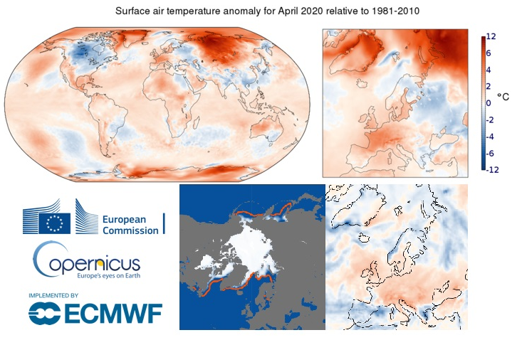 Secondo il bollettino climatico  mensile del Copernicus Climate Change Service (C3S), implementato dall’European Centre for Medium-Range Weather Forecasts delle Commissione Europea, che riporta i cambiamenti osservati nella temperatura globale dell’aria in superficie, della copertura di ghiaccio e delle variabili idrologiche, «A livello globale, aprile 2020 ha registrato le stesse temperature di aprile 2016, il più caldo mai registrato. Le temperature sono state particolarmente al di sopra la media nell’Eurasia centrale e settentrionale e in alcune zone della Groenlandia e dell’Antartide, ma sensibilmente sotto la media in vaste aree del nord America. In Europa le temperature sono state molto al di sopra della media in diversi Paesi occidentali, ma al di sotto della media nelle zone a nord est».